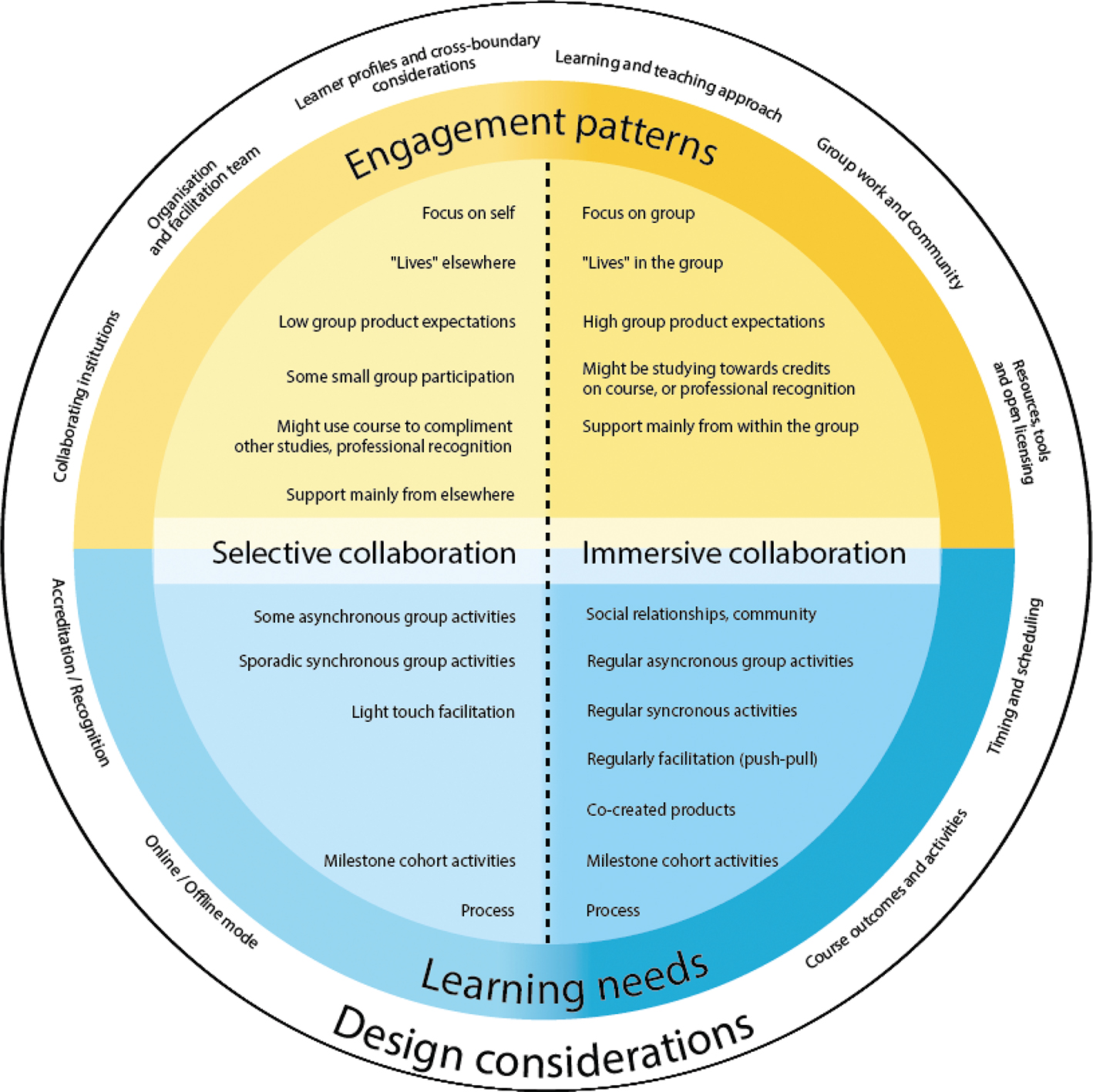 The findings around boundary crossing suggest that collaborative open learning in the collective case study (FDOL132 and #creative HE) was experienced by participants as an opportunity to learn from, and with a diverse set of individuals, as formal or informal learners, including academic staff, students and the public. They experienced collaborative open learning that stretched seamlessly across online, offline and mobile spaces, thereby creating valuable opportunities for flexible engagement that seems to have had a motivational impact on engagement and opened participants’ horizons.