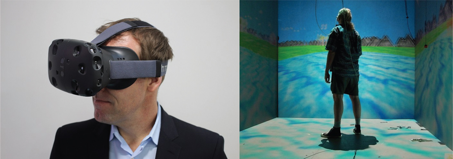 Figure 1. Virtual Reality Examples: (Left) HTC Vive headset that is tracked in 3D space (Vive.com 2018). (Right) A CAVE where the displayed image is projected onto a surrounding surface from the perspective of the user (Visbox.com 2018).