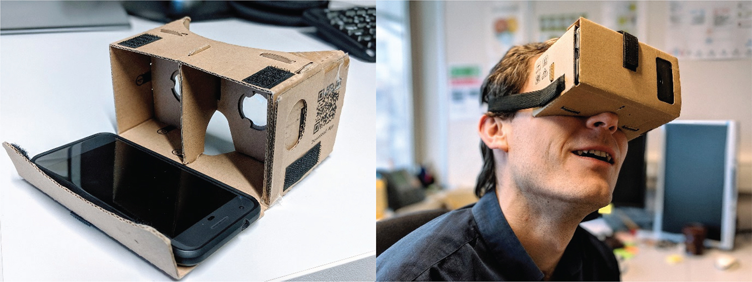 Figure 2. (Left) Shows how a mobile phone is placed as the display for Google Cardboard head-mounted display. (Right) Shows the placement of the Google Cardboard display in use.