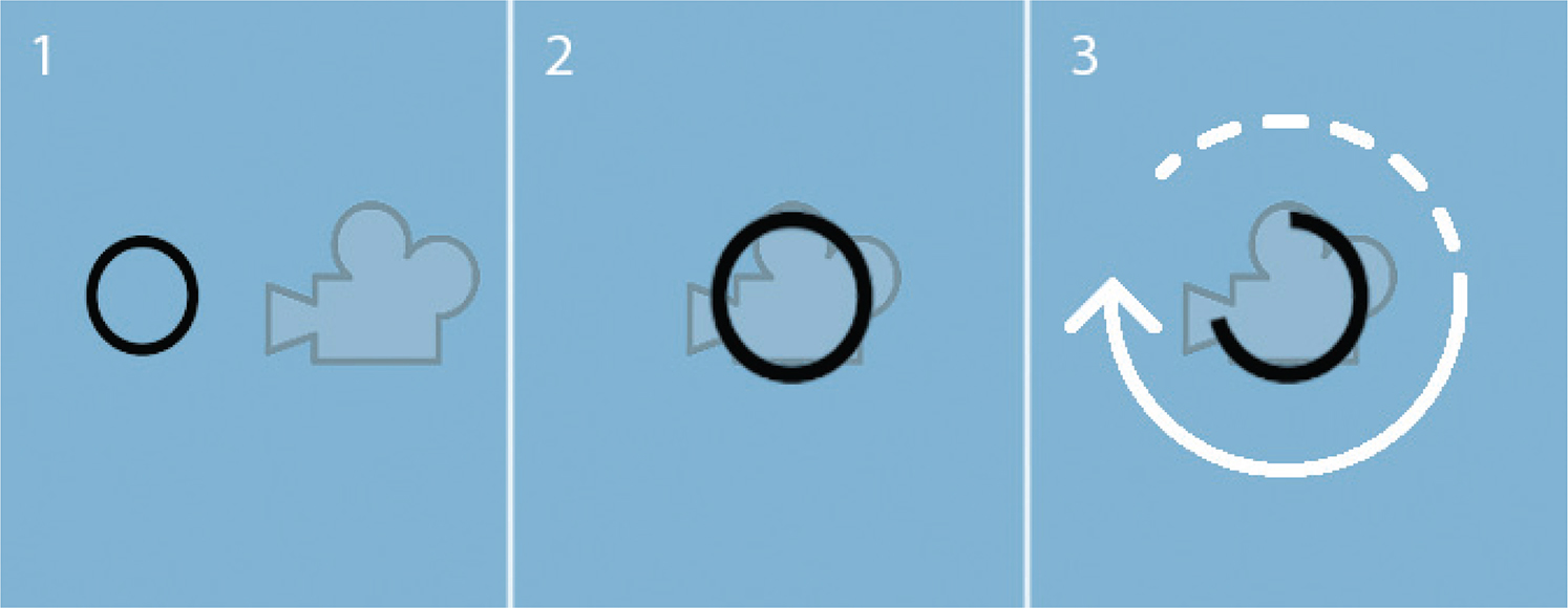 Figure 4. Image sequence showing time on target selection method of camera icon (panel 1). User reticle is positioned central to the viewport (Black circle, panel 1). User positions reticle over camera icon (panel 2). Reticle expands to provide feedback that icon is selectable. The reticle then redraws itself over 2 s (panel 3, white arrow shows direction of redraw). When the circle is fully redrawn, the item is selected.