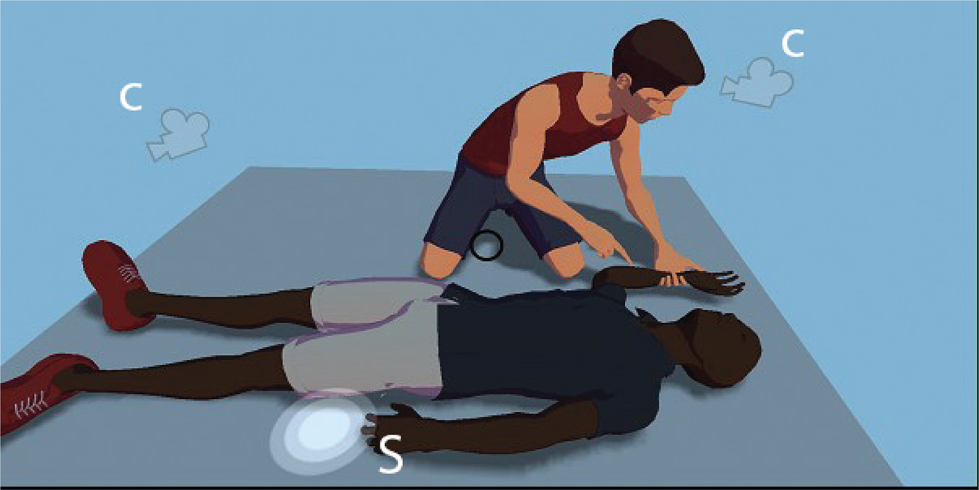 The RPA displays two virtual avatars performing the recovery position sequence. The avatar performing the sequence is named ‘Helper’. The avatar placed into the recovery position is named ‘Casualty’. The design of RPA was based upon the needs of observational learning within a DBT framework and the hardware considerations for mobile VR. To view a video, walking through the application, please go to: https://youtu.be/O6s1Iiea1NU. The two areas of focus to inform the design process were: