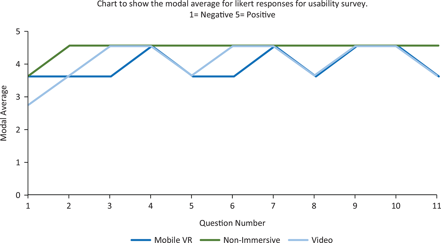 For all groups, the usability questionnaire showed positive attitudes towards the use of the RPA for education (see Figure 8). Questions 2–10 examine the RPA’s ease of use. Modal averages were 4 or 5, representing positive and very positive. This indicates that participants found the application easy to use and felt confident in utilising the functions. Questions 1 and 11 relate to the participants’ perception on whether they would use the application frequently and recommend it to others. Participants’ modal average responses for the mobile VR and Non-Immersive groups were 4 and 5, respectively. This indicates that participants would use the RPA frequently and recommend it to others in a mobile VR or desktop format. Question 1 of the usability survey for the Video group had a modal average of 3. This shows that for the video format, participants are neutral in their option to use the RPA frequently and may not use a video format as frequently as a desktop or mobile VR platform.