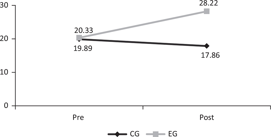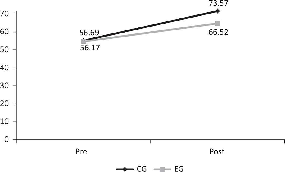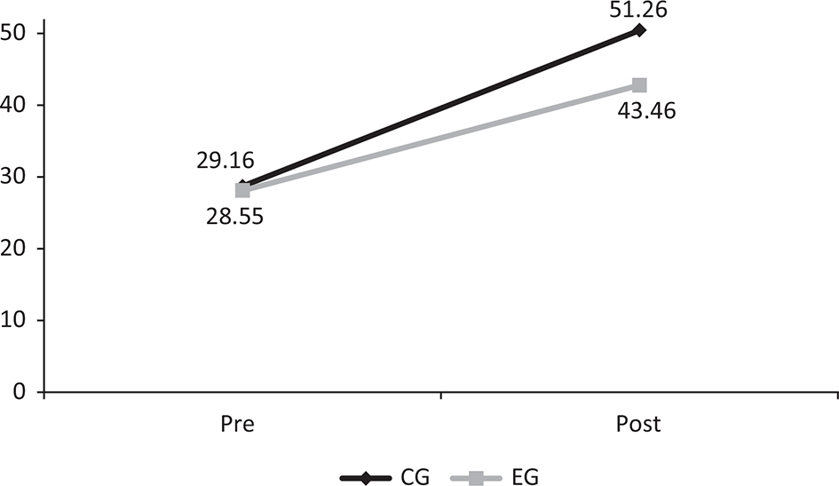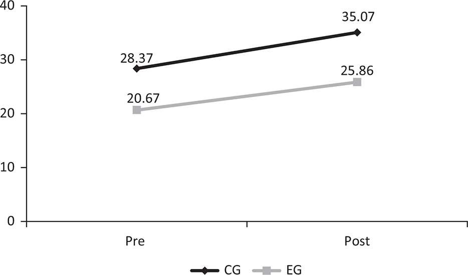 Figure 1 shows the results of the 2 × 2 mixed model analysis for MD. Results indicated no significant differences between the groups, F(1,123) = 1.93, p > 0.05 and time of testing, F(1,123) = 1.67, p > 0.05. However, a significant interaction was detected, F(1,123) = 4.81, p < 0.05, with results indicating that only the EG improved from the pre- to the post-test.