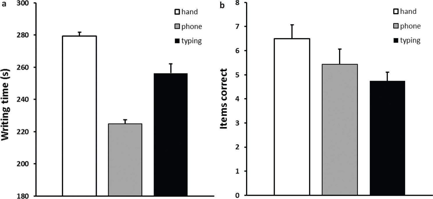 The material for experiment 2 was identical to that for the pilot experiment with two stories from the WMS-R logical memory subtest (Wechsler 1987), which is designed to test episodic memory, and a similar one that was created for this study (story C, Appendix A). The three stories were each around 60 words long. For score-recording purposes, there was a 25-item list of details, persons and occurrences from each story (two from WMS-R and one created for this study). For each recalled detail, one point was earned, meaning that one could score a maximum of 25 points. Data analysis methods were identical to those used in experiment 1. For the handwritten test, a pen and paper were used, whereas the participants’ own laptops were used for keyboarding and their own mobile phones were used for touchscreen keyboarding. On the mobile phones, only thumbs were used for writing.