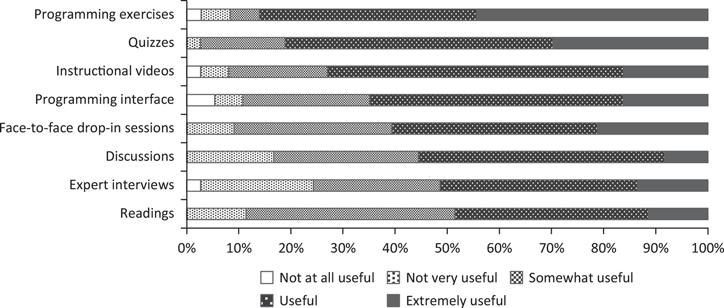 Figure 1 shows that the most valued types of activity in terms of their perceived usefulness (all median 4) were programming exercises (86% useful/extremely useful), quizzes (81%), instructional videos (73%), the programming interface (65%), the face-to-face drop in sessions (61%), discussions (56%) and expert interviews (51%). The least valued type of activity (median 3) was the readings (49% useful/extremely useful).