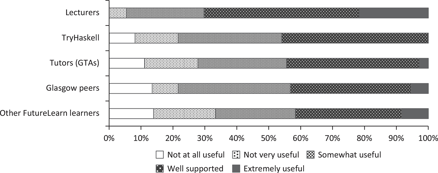 Figure 2 shows that learners felt most supported by their lecturers (70% well/extremely well supported, median 4). They felt less supported by other sources of help (all median 3): the TryHaskell programming interface (46% well/extremely well supported), graduate teaching assistants (45%), their University of Glasgow peers (43%) and other learners on the FutureLearn MOOC (42%).