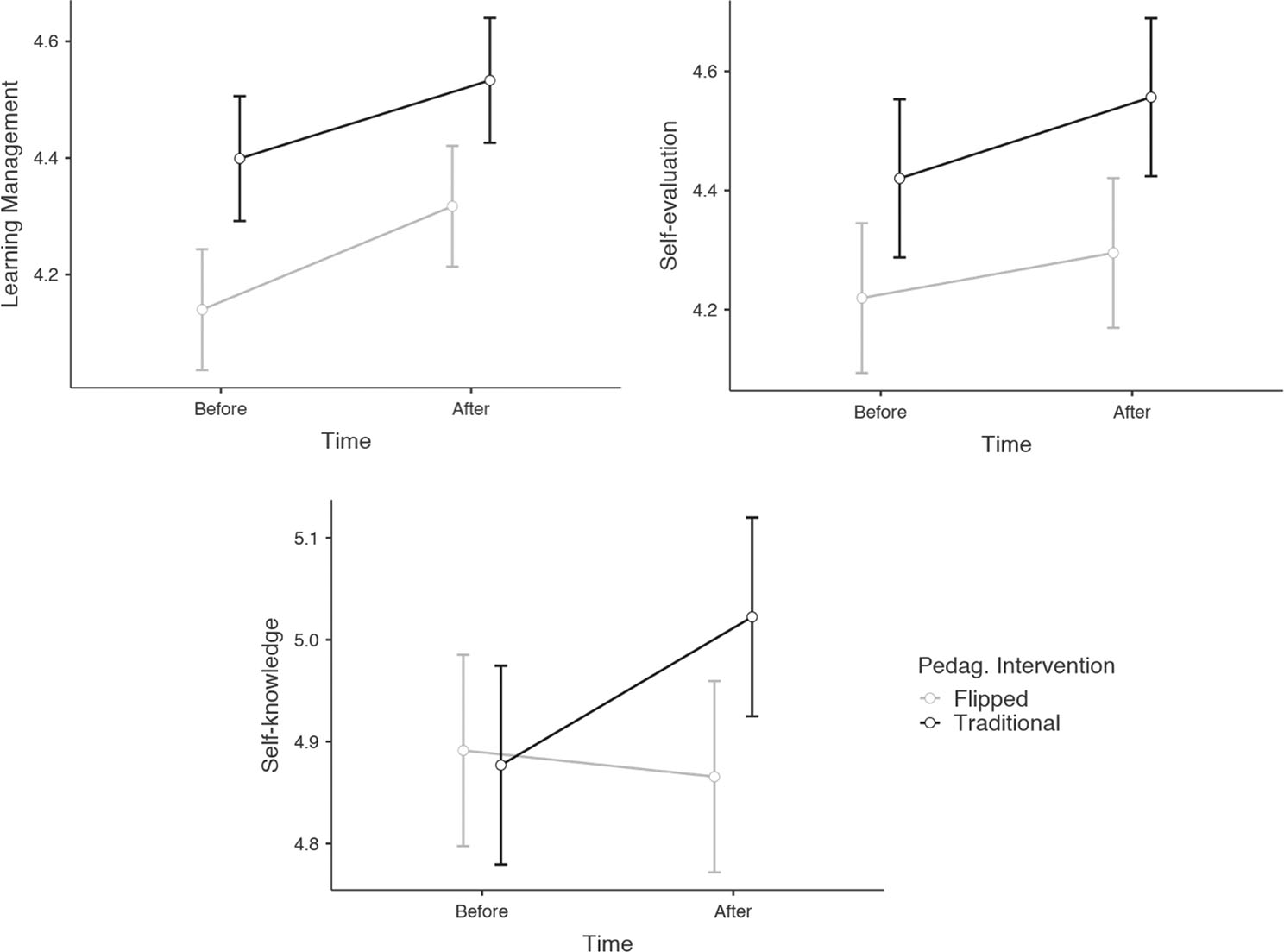 As shown in Figure 1, pupils reported higher values of learning management after the intervention, an RM ANOVA revealed the main effect of time [F(1,108) = 6.66, p = 0.011, ηp2= 0.06]. Yet, these effects of time were not found for self-evaluation [F(1,108) = 1.27, p = 0.263, ηp2= 0.01], or self-knowledge measures [F(1,108) = 1.02, p = 0.314, ηp2= 0.01]. Finally, the RM ANOVA did not reveal an interaction between the type of pedagogical intervention and time for any of the factors on the questionnaire (Figure 1).