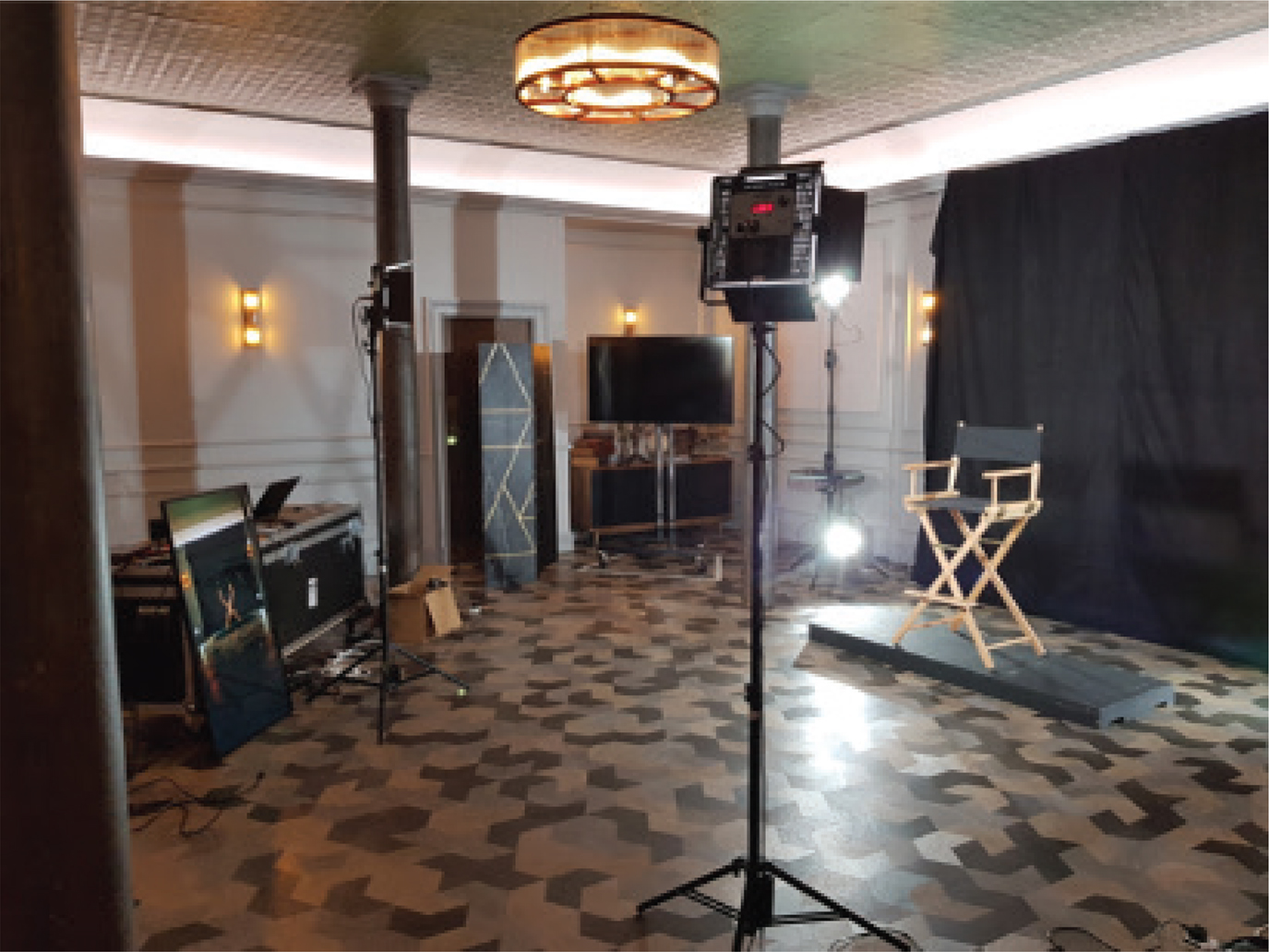 The equipment comprised a ‘capture studio’ and a ‘display studio’. The capture studio (Figure 2) comprises a video production studio containing a high-definition camera, lighting, audio equipment and set dressing. In addition, the set contains replicas of any furniture that appears in the display studio, a black curtain as a backdrop and one or more reference monitors for the presenter showing a live feed of the audience.