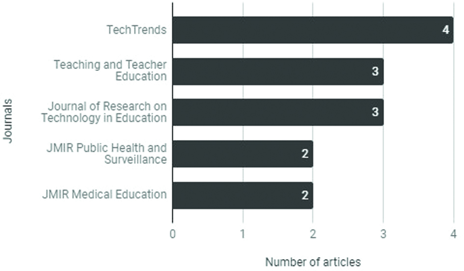 The articles were published in 40 different journals. Figure 2 shows the distribution of the articles in journals with two or more articles identified in our review. Three of these journals are relevant to education sciences and two to health sciences.