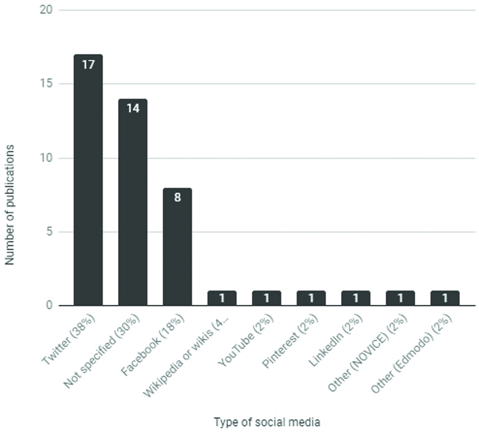 With respect to social media platforms, Twitter was the most studied social media platform in our literature review. While Twitter was not the social medium most used by Internet users, it seems to have an active presence in the professional life of citizens, serving as a platform for professional global digital communication. This focus on Twitter is aligned with the growing interest indicated in some of the previous reviews (Zimmer and Proferes 2014). Facebook, the most widely used social media platform in general use today (Smith and Anderson 2018), was the most visited platform after Twitter. Twitter may have become the preferred platform over other platforms such as Facebook ‘due to advantages such as short-form messaging, easily grouped themes with hashtags, and rapid spread of messages (going viral) with easy sharing through retweeting’ (Goodyear, Casey, and Quennerstedt 2018).