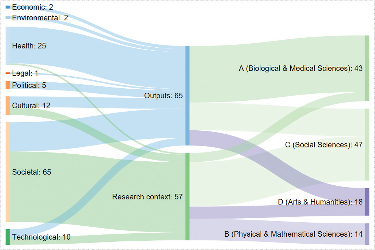 Figure 2. Relationships between the two main categories of impact case studies identified within the sample (shown in the middle), the type of impact presented by the cases (left) and the panels the cases fall within (right). Note that the three cases where ‘e-learning’ was only included as a testimonial affiliation are not shown.