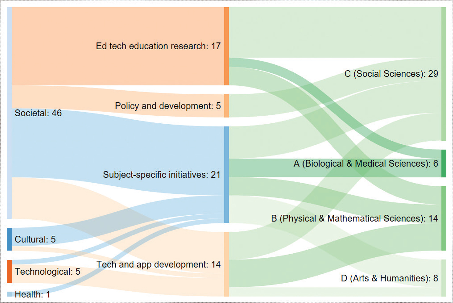 As noted, the range of research covered by an impact case study can be broad. Cases were assigned to the category that best described their positioning in relation to educational technology and related terms, but a case study may have had links to several categories. The four sub-categories of case studies are also associated with different profiles in relation to the impact types reported, and submission panel (Figure 3). The number of case studies per sub-category and panel are shown in further detail according to unit of assessment in Table 7. Subject-specific educational technology initiatives span a wider range of subject areas and impact types. The categories of educational technology-focused educational research and technological and app development are both broadly split between panels C (education unit of assessment) and B (computer science unit of assessment). However, a key distinction is that while educational technology-focused educational research is associated exclusively with societal impact, technological and app development also includes technological and cultural impacts.