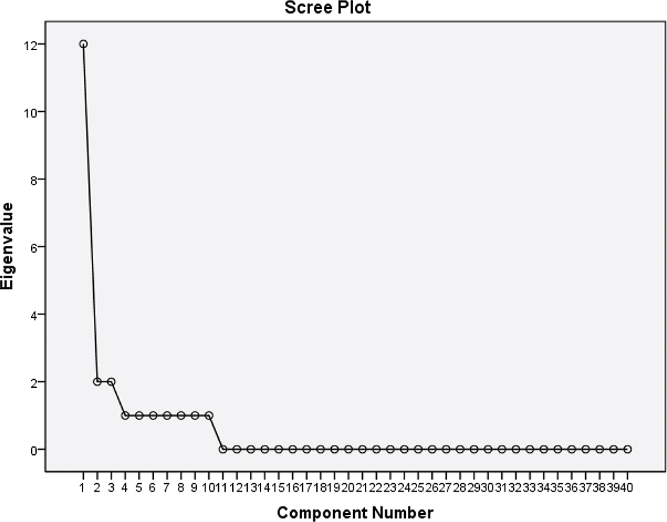 Regarding PCA, the KMO index was 0.812, indicating the adequacy of the sample size. The Bartlett’s test also showed the suitability of the data for factor analysis (p = 0.001). In another factor analysis, 10 factors were extracted at first. The lowest acceptable factor load was considered at 0.35 (Dadgaran et al. 2016) so that factors with lesser amounts were eliminated. After reviewing various multi-factor solutions and considering the content and subject areas of items, finally the six-factor solution was selected. Three items that had no effect on the total explained variance and were not loaded in any of the six principle factors were omitted (number 36, 38 and 39).The final instrument, named as ‘e-learning Educational Atmosphere Measure’ (EEAM), included 40 questions that covered six factors consisting of programme effectiveness, teaching quality, ethics and professionalism, learner support, safety and convenience, and awareness of the rules. The scree value of each of the six factors was greater than one and these six factors accounted for 68.53% of the total variance of the variables. Table 1 shows rotated matrix of loaded items in these six factors. Also, the rotated graph of the scree values is demonstrated in Figure 1. Finally, Table 2 shows the EEAM’s factors and items.
