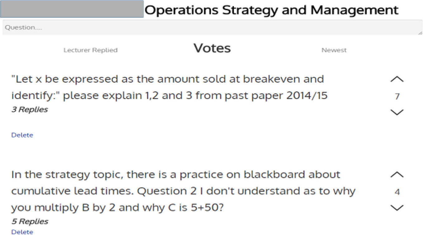 Questions that received negative votes were those that expressed sentiments such as personal criticism of the lecturer, or questions seen by students to be shortcutting ‘Missed the last seminar, what was the essay title?’. There were very few questions that received negative votes, which suggests that students would reserve downvotes only for a limited range of questions.