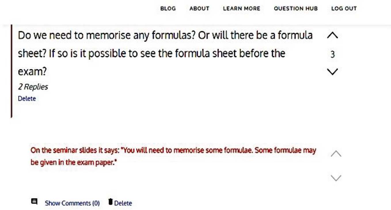 These questions were low-level functional questions, regarding arrangements, ‘Will there be a formulae sheet?’, ‘How long is the examination?’ and ‘Where can I find past examination papers?’. These questions formed the second largest grouping, with several repeated questions from different users asking the same query.