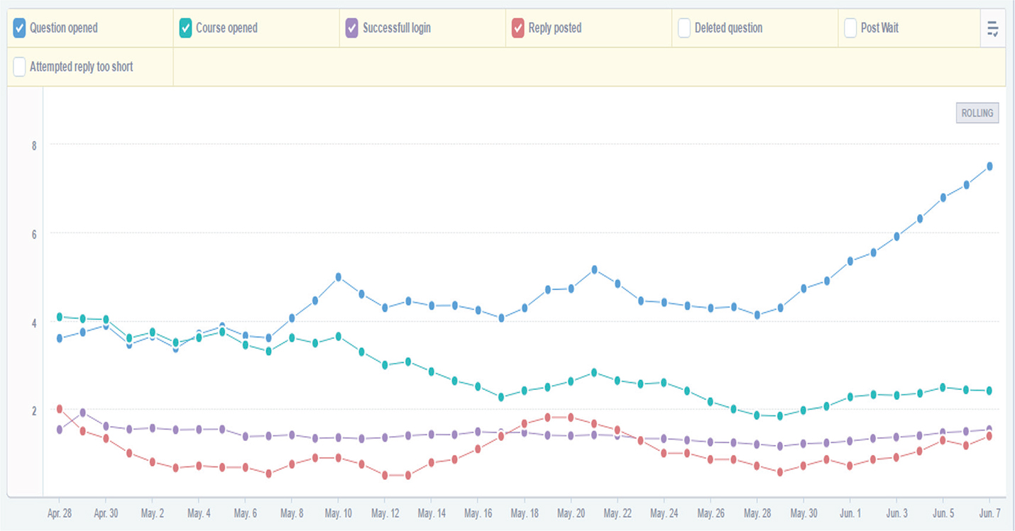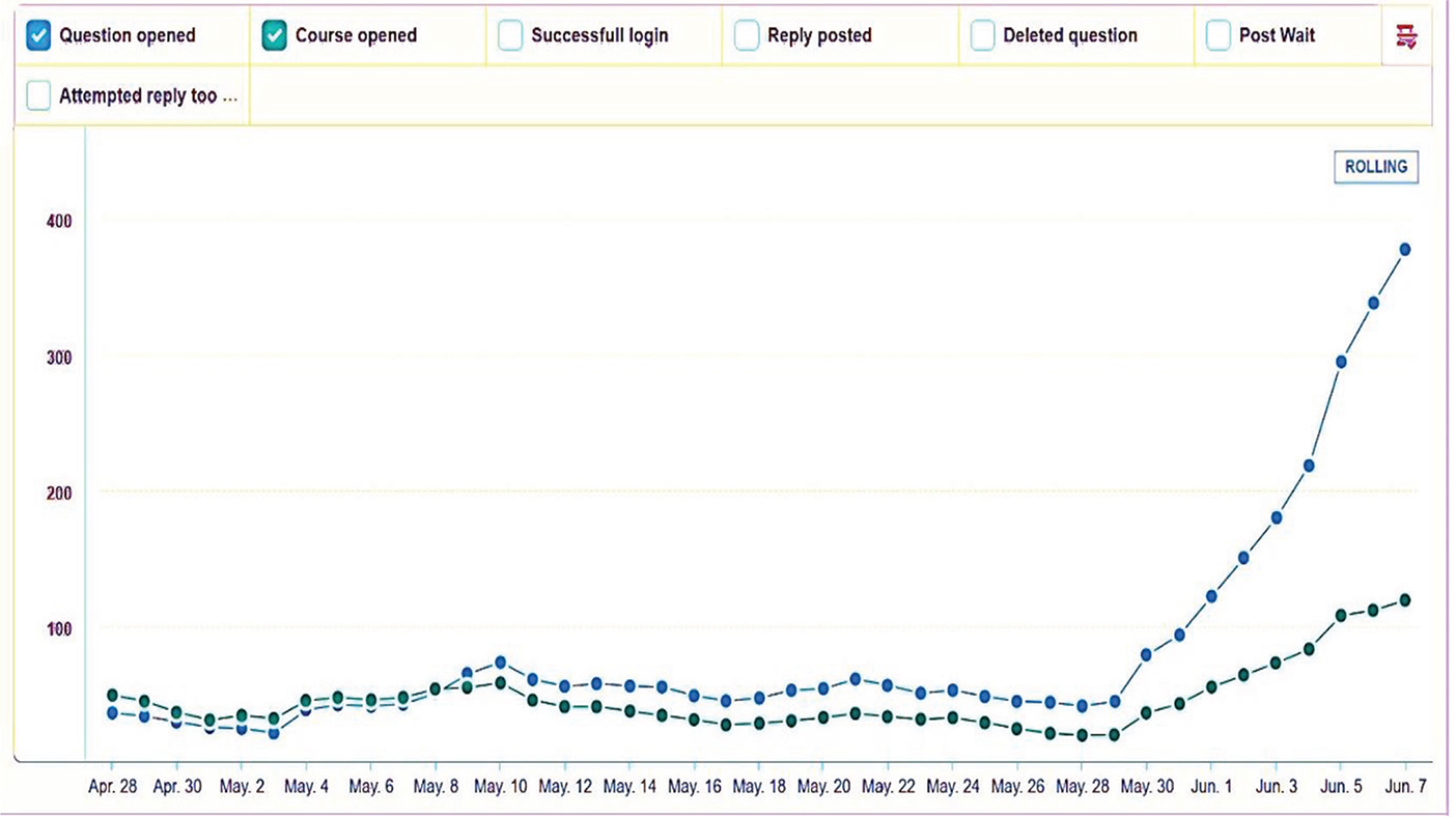 Figures 3 and 4 outline the adoption of the platform over time. Initially, there was a fairly low uptake; however, in the lead up to final assessment there was a rapid uptake in the levels of access. The number of responses during these periods was fairly consistent (see Figure 3).