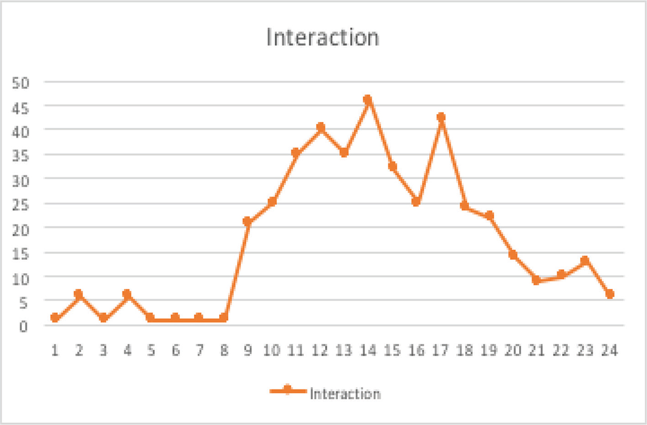 The uptake and use of this voluntary platform appears to have been relatively successful. Of the questions posted, these were opened 4611 times, suggesting that even though the questions may be limited in number they were made use of by students. During the pilot the uptake of the platform increased over time, in contrast to the findings of Wang (2015), who raised concerns over this issue when exploring the use of interactive class-based systems. During the early part of the trial, students who emailed staff to ask a question often received a reply to repost the question on the platform. As this became unnecessary after a while, the increasing use of the platform suggests that this increase was student-driven. The system appears relatively successful in increasing interaction outside of class time, as proposed by Cavanagh (2011) and therefore encouraging active time on task with several interactions occurring outside of core hours (see Figure 5).