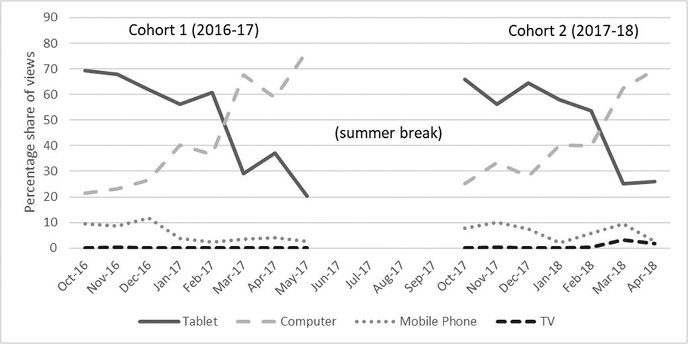 The possibility that a decline in tablet use may be due to loss or damage cannot be ruled out, as replacements would not always be provided free of charge to students under these circumstances. However, it is likely that loss or damage of tablets accounts for only a small proportion of the large changes in device usage observed in this study. It is also possible that differences in module activities throughout the academic influenced tablet use. For example, students may be more likely to use personal computers when preparing for assessment in the second half of the year. Personal computers with keyboards tend to be preferred over touchscreen tablets when typing (Kim et al. 2014; Myrberg and Wiberg 2015; Reyal, Zhai, and Kristensson 2015). This preference for personal computers while typing may have influenced the choice of device to view video lectures later in the academic year.