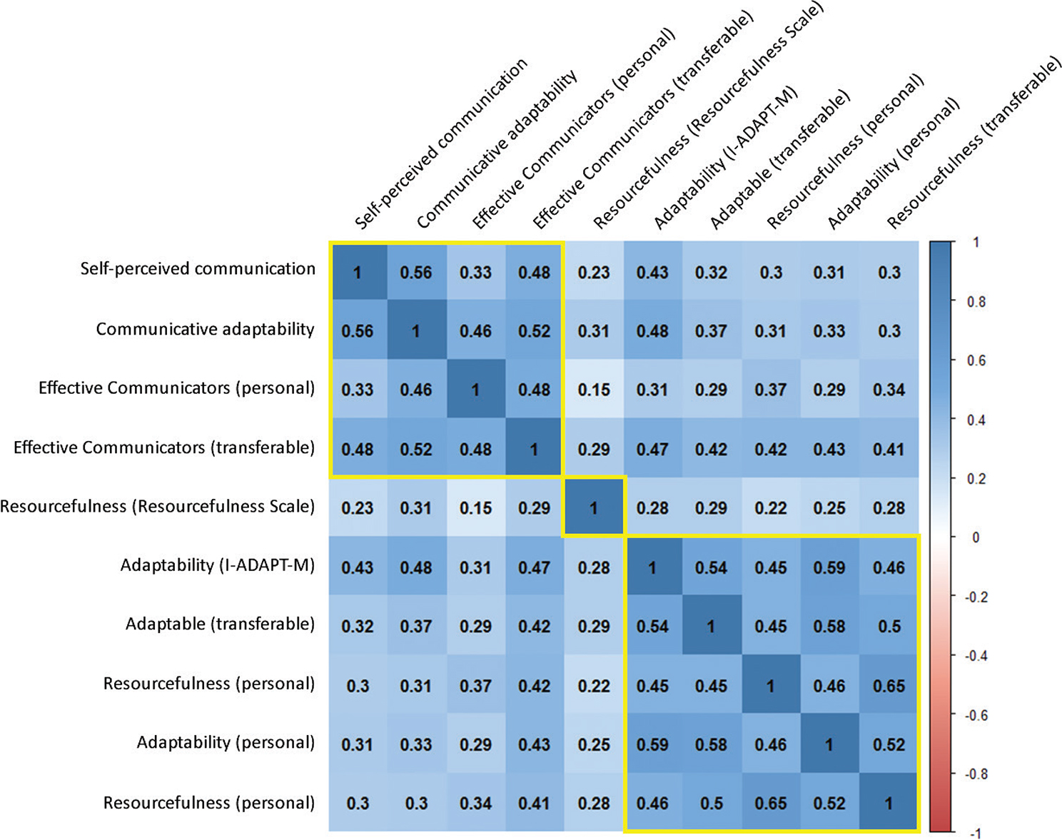 In summary, 10 measures were used: four intended to measure communication (the previously validated CAS and SPCCS, plus two measures based on the university definition of Effective Communicators), three intended to measure adaptability (I-ADAPT-M plus two based on the university definition) and three to measure resourcefulness (the Resourcefulness Scale plus two based on the university definition).