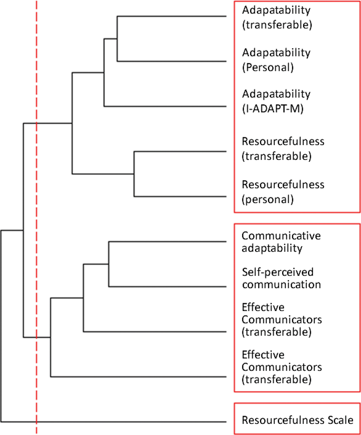 Much like a family tree, the dendrogram illustrates the degree of relatedness between ‘family members’, which is expressed by the horizontal distance between elements. Elements may be grouped at any level in the hierarchy, but the level selected here (indicated by the dashed line) results in three distinct groups of measures. Communication measures fall into one group, and adaptability and resourcefulness measures fall largely within another, with the Resourcefulness Scale scores forming a distinct group of their own. There are some further subtleties – the personal dimension of the university’s Effective Communicators attribute is slightly more distantly related to the other communication measures, for example – but overall it is clear that a high degree of correlation exists between communication measures and that adaptability and resourcefulness, as defined by the university, are closely related. Furthermore, all three measures of adaptability are closely related, suggesting that I-ADAPT-M is a suitable instrument for measuring adaptability in this context. Correlations with the personal and transferable dimensions of the university definition are moderately strong (0.59 and 0.54, respectively). However, the Resourcefulness Scale does not correlate closely with the university definition, and these scores are something of an outlier if each attribute is thought of as a component of a larger notion of ‘graduateness’.