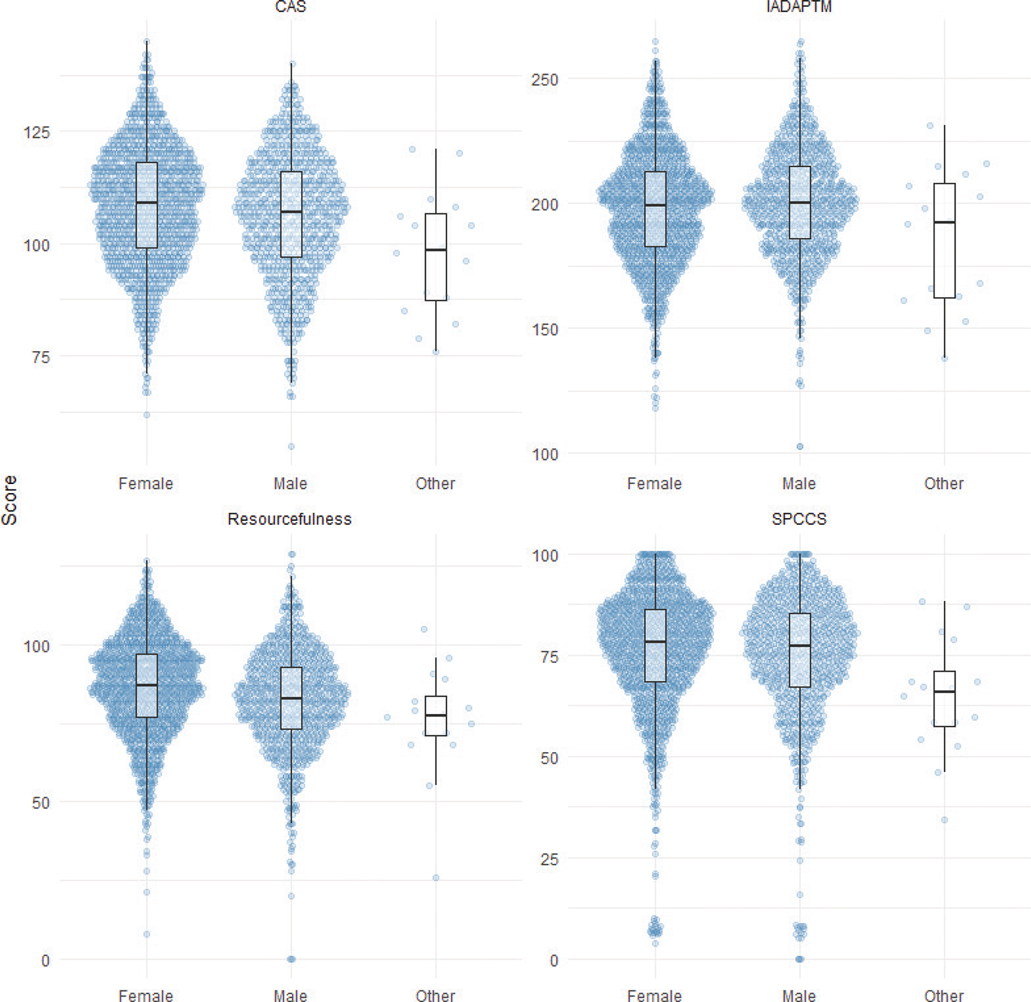 As continuous variables, it is more appropriate to examine these data in terms of correlation, as shown in Table 2. The Spearman’s rank correlation coefficient for the two most positive correlations, SPCCS and I-ADAPT-M, is 0.12 and 0.16, respectively, with p-values of <0.001. This indicates a highly significant but very small positive correlation between age and these attribute measures. Correlation coefficients for the other two measures are negligible (0.0258 for the Resourcefulness Scale and −0.0222 for CAS), which confirms the above observation that there is no obvious relationship between these measures and age, bearing in mind the limitations imposed by a relative lack of data at the upper end of the age range.