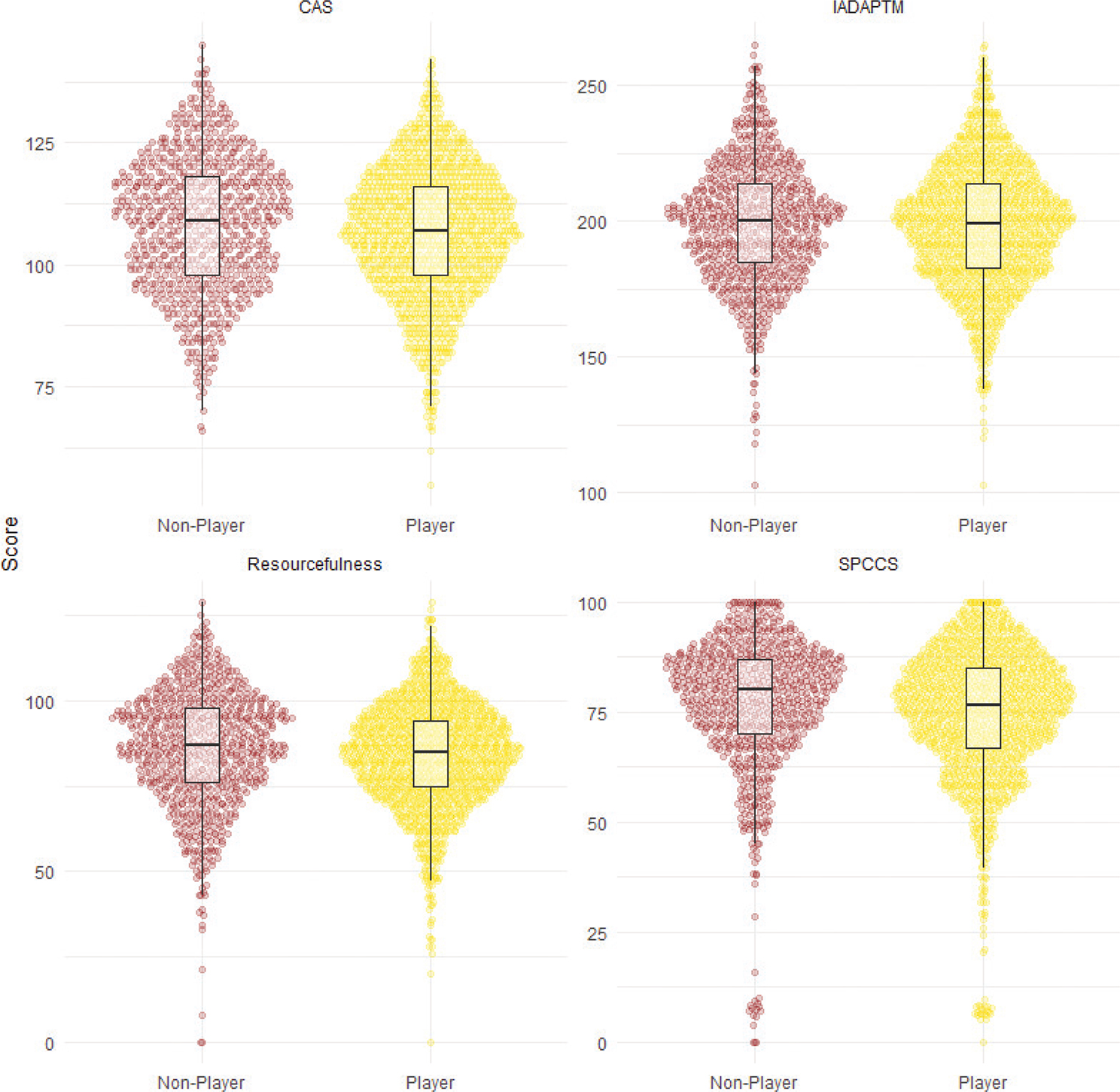 The four main attribute measures are visualised as a set of violin plots, shown in Figure 4. These plots highlight the small but observable difference between the two groups on measures of communication (CAS and SPCCS) and resourcefulness. As suggested by the more granular plots, however, adaptability (I-ADAPT-M) is largely unrelated to game play.