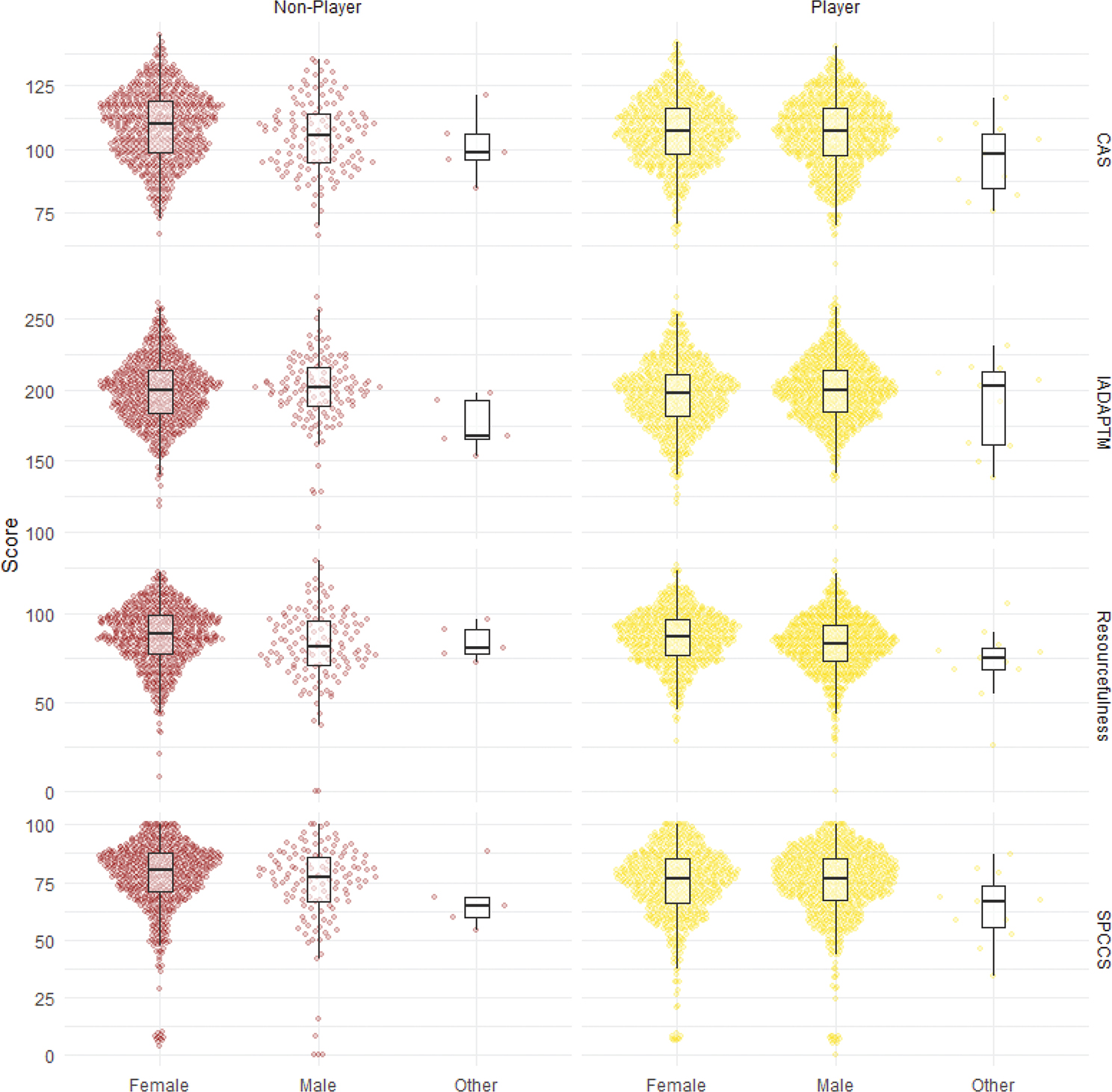 To allow an assessment to be made if the association between game playing status and attribute scores are independent of gender, Figure 5 shows attribute scores disaggregated by both game playing status and gender. This highlights that the largest gender effect is observed for ‘other’ (non-binary) scores and that male and female scores are similar within each strata of game playing status.