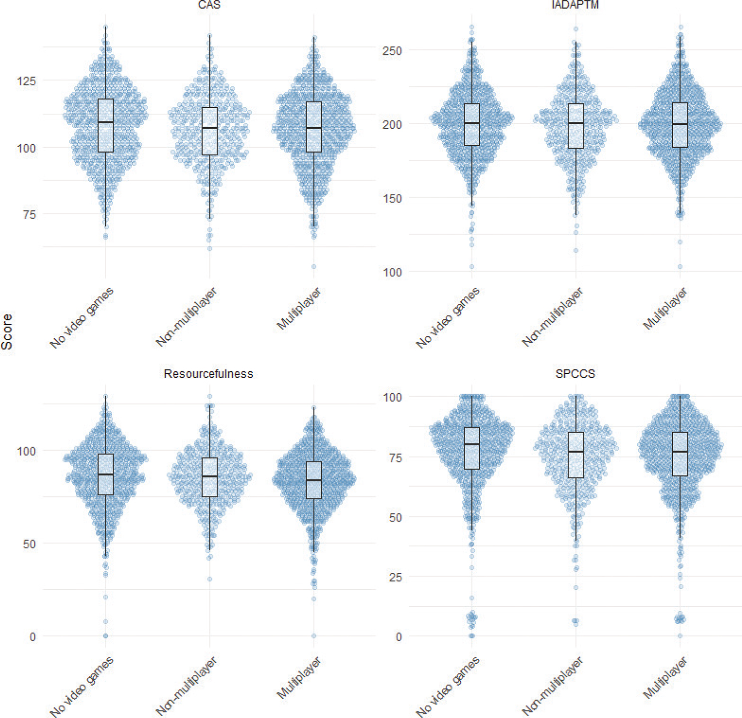 While non-players again score well here, the most striking feature of these data is that those who play video games for more than 8 h per week score worst across all measures, except for adaptability, where there is no significant difference in mean scores across categories (p = 0.754). Thus, moderate and non-players score better than ‘excessive’ players do.