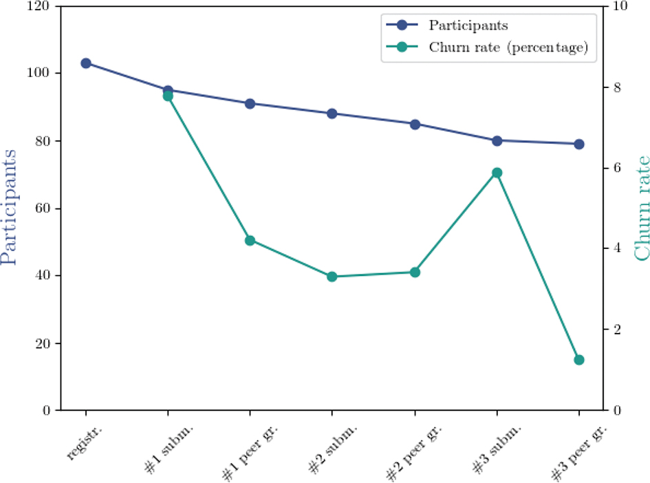 Figure 2. Participant population (left axis) and corresponding churn rate (right axis, as percentage) along the semester.