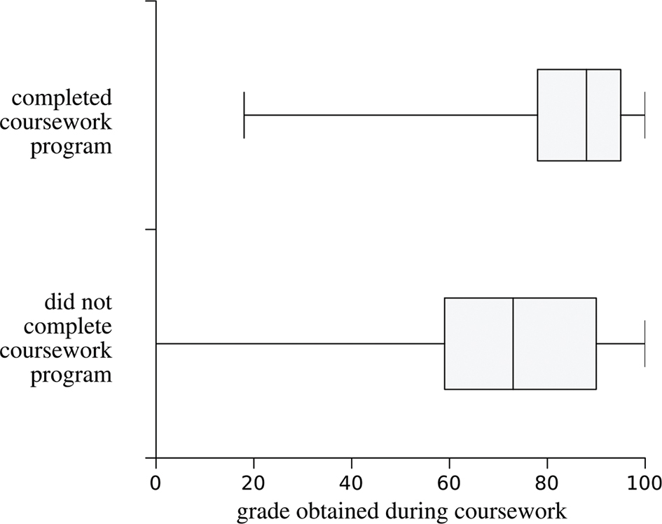 Coursework grades were overwhelmingly positive (av. 85 pts, med. 85 pts, f. 0%; see Figure 3) and helped 82% of participating students with an average of 5 pts towards their final mark (Figure 5). Nevertheless, the distribution of final marks for the course was almost unchanged compared to the previous years (av. 63 pts, med. 69 pts, f. 26%). A lower performance was observed for students who dropped out of the coursework programme (med. 51 pts) or who did not take part in it (med. 33 pts), although their marks were very broadly distributed. No correlation is found between marks obtained in the coursework programme and in the examination (Figure 5).