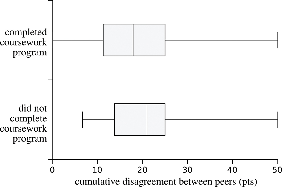 Figure 4. Distribution of cumulative peer disagreement for two groups of students: on top, students who completed the peer-graded coursework programme; at the bottom, students who dropped out of the programme.