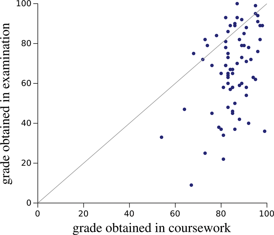 Figure 5. Final grades obtained by students in the coursework programme (horizontal axis) and during the final examination (vertical axis).