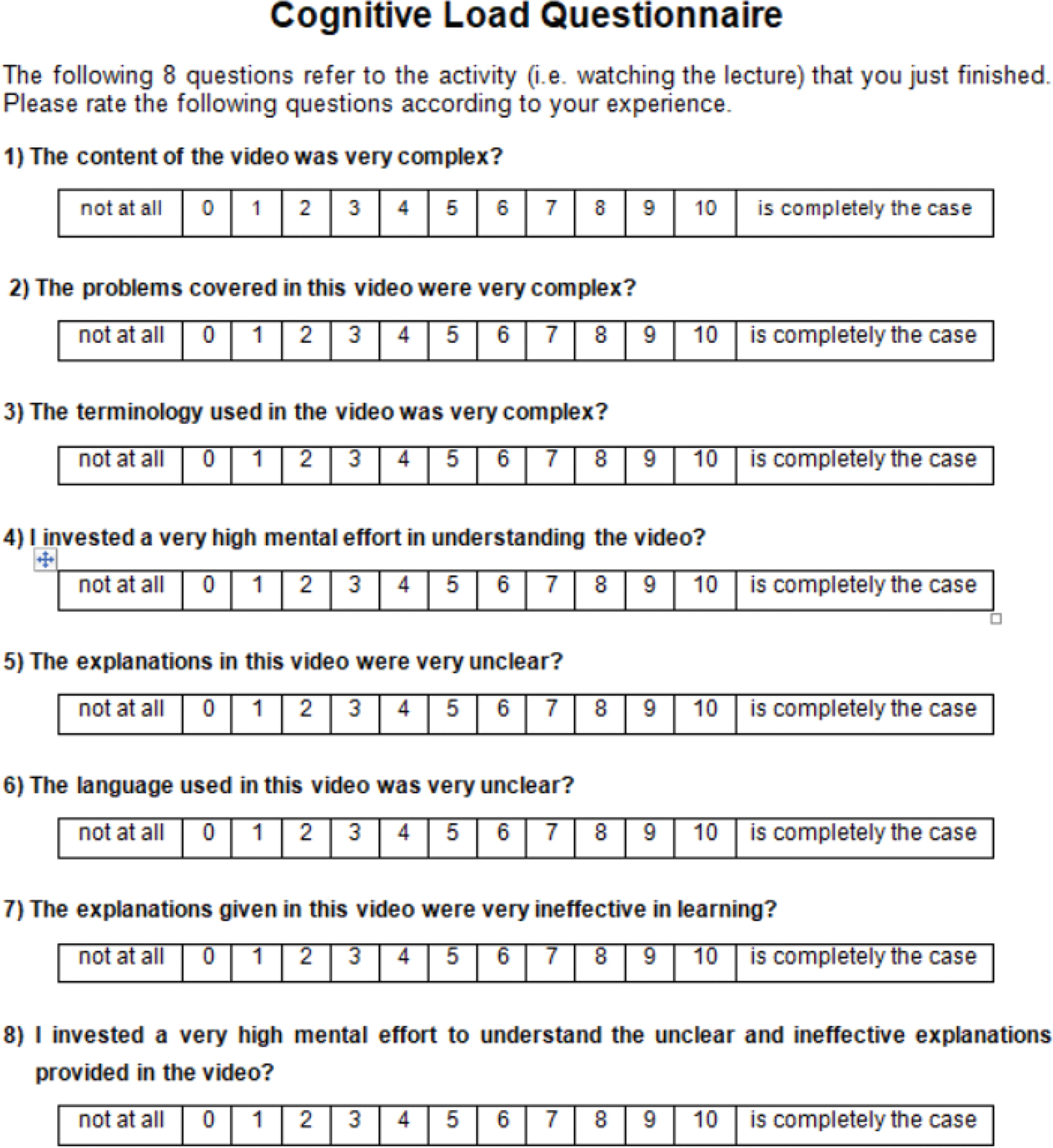 After each video, the participants were asked to answer a self-rated cognitive load questionnaire and a comprehension test on the content discussed in the video.