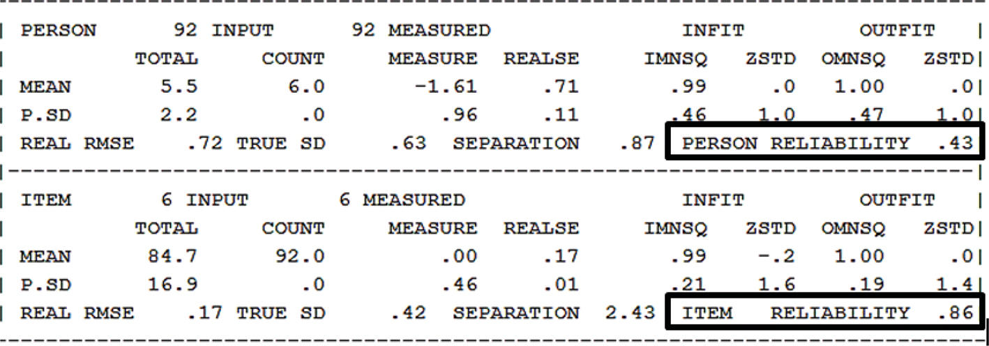 Linacre, J.M. (2006) WINSTEPS Rasch Measurement Computer Program, Winsteps.com, Chicago, IL.