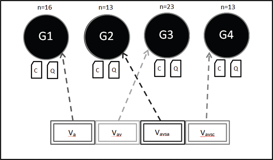 Figure 5 represents the design of the experiment describing the groups and the different PMs they watched. The first group, G1 (audio-only) had 16 participants; G2 (video with audio and verbatim subtitles) had 13 participants; G3 (video with audio) had 23 participants; and G4 (video with audio and edited subtitles) had 13 participants. From Figure 5, it is also clear that each of the groups watched a different presentation of the same video (Va, Vav, Vavsa, Vavsc). Afterwards, the participants had to complete a comprehension test (C) and a cognitive load questionnaire (Q) on the content of the video.