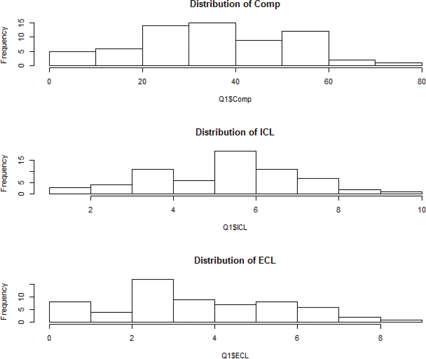ICL refers to cognitive load caused by the task difficulty, whereas ECL refers to the cognitive load caused by the presentation format of the task. Provided that the PMs of the videos were different for each group, a greater difference was expected for the ECL between the groups than for the ICL. Figure 6 gives the distribution of the data points for each variable for the full sample.
