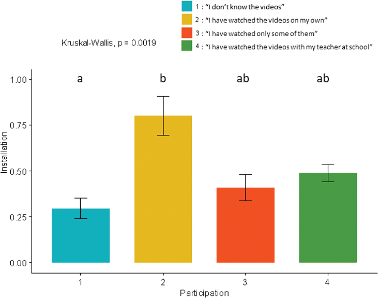 Figure 1. Bar plot showing the average values for Installation variable, with standard error bar, for every participation group. Kruskal–Wallis p-value is shown top left (p = 0.0019). Compact letter display shows significant differences (p < 0.05) between Groups 1 and 2.