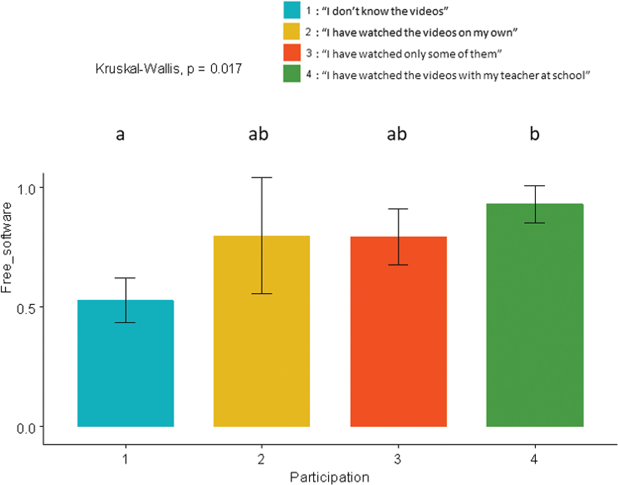 Figure 2. Bar plot showing the average values for Free_software variable, with standard error bar, for every participation group. Kruskal–Wallis p-value is shown top left (p = 0.017). Compact letter display shows significant differences (p < 0.05) between Groups 1 and 4.