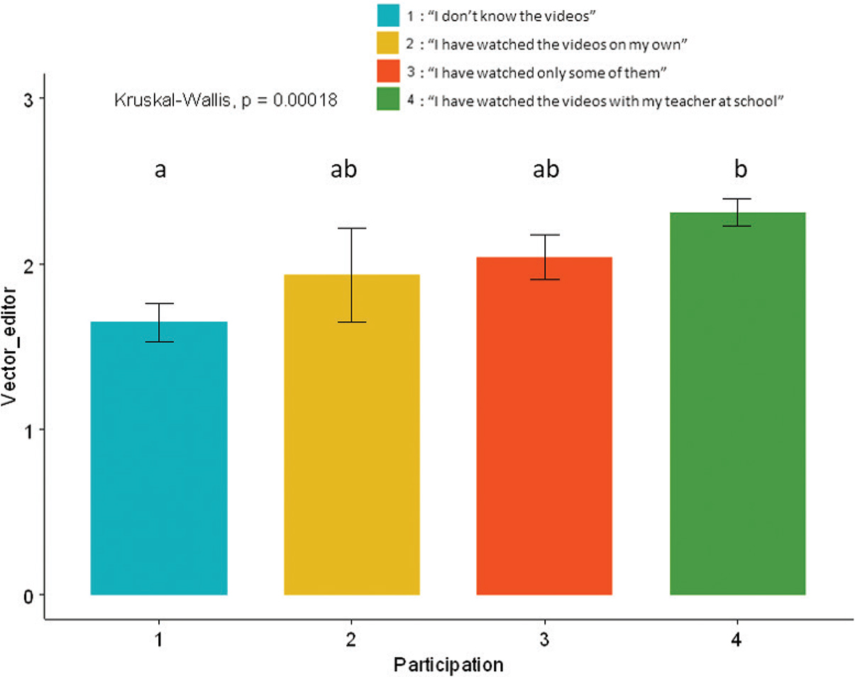 Figure 3. Bar plot showing the average values for Vector_editor variable, with standard error bar, for every participation group. Kruskal–Wallis p-value is shown top left (p = 0.00018). Compact letter display shows significant differences (p < 0.05) between Groups 1 and 4.