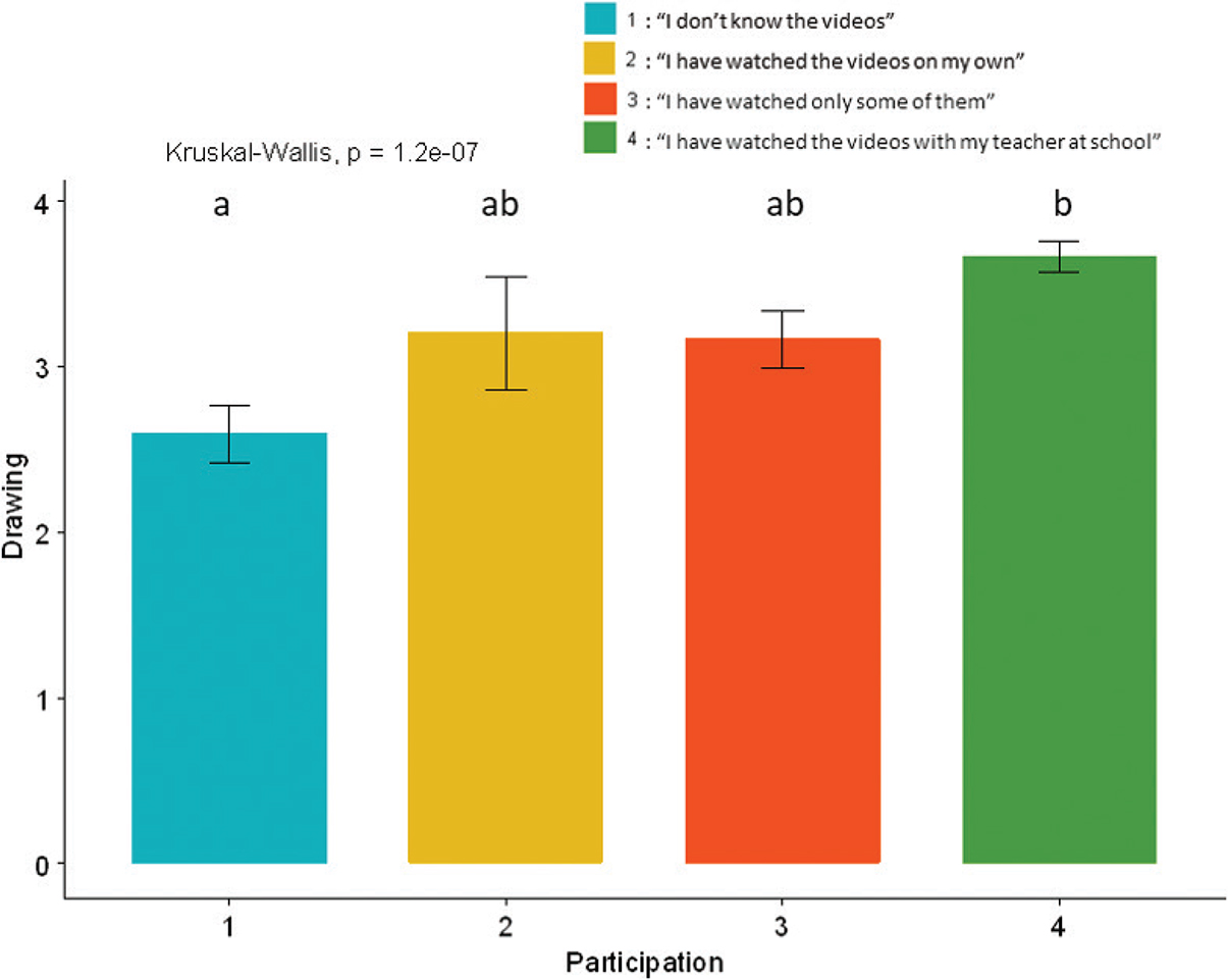 Figure 5. Bar plot showing the average values for Drawing variable, with standard error bar, for every participation group. Kruskal–Wallis p-value is shown top left (p = 1.2e-07). Compact letter display shows significant differences (p < 0.05) between Groups 1 and 4.