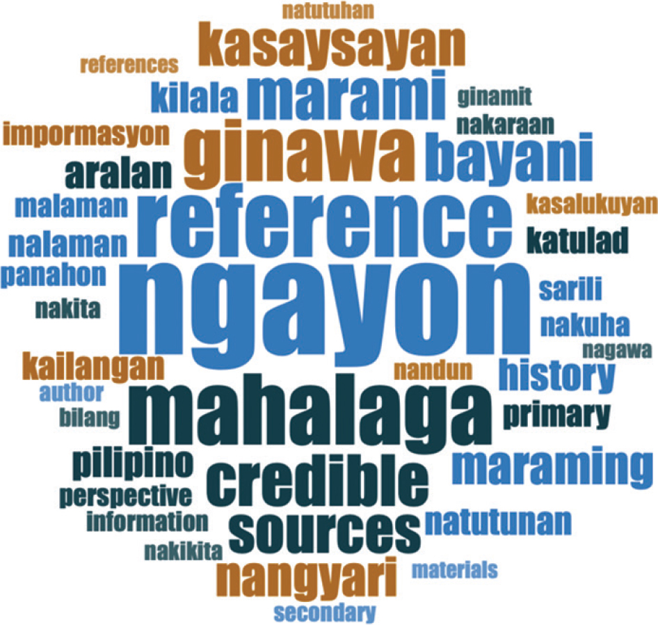 The analysis of the qualitative data gathered from the analysis of focus group interviews, reflection entries and digital stories initially resulted in the identification of the most commonly occurring words, which were visualised through a word cloud (Figure 1). Such form of data visualisation helped in determining how words, phrases and sentences were used in specific contexts. Among the most frequently occurring words included in the word cloud were a combination of Filipino and English words, namely ‘ngayon’ (present), reference, ‘mahalaga’ (significant), ‘ginawa’ (had done), credible, sources, ‘marami’ (many), ‘kasaysayan’ (history), ‘nangyari’ (happened) and ‘bayani’ (hero). These words offered an initial viewpoint for discovering patterns and relationships that exist in the qualitative data, allowing the researchers to further explore the concept of historical understanding. For instance, exploring the words ‘ngayon’ (present) and ‘nangyari’ (happened) was a starting point for analysing the concept of continuity, while learning more about the word ‘mahalaga’ (significant) was beneficial in further comprehending the concepts of historical significance and historical emphasis. The words ‘reference’, ‘credible’ and ‘sources’ were important for exploring the concept of historical evidence. ‘Bayani’ (hero) was a commonly occurring word that aided in grasping the concept of values and traits identification. It should be noted that the participants responded and wrote in Filipino most of the time, and there were some instances when they would switch randomly between English and Filipino.