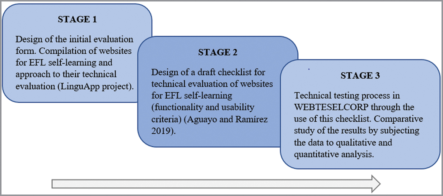 In stage 2, a checklist was specifically created and implemented to analyse the ESOL Courses website. This evaluation tool was designed so that the analysis covered the essential aspects of web functionality and usability. Hence, our work is based on an extensive reading of the most relevant literature in this regard – particularly the ISO 9126 and 25010 Quality Models for external and internal quality (ISO 9126-1, p. 2000) – together with an exhaustive selection of checklists from noteworthy studies on technical website evaluation, some of them on learning websites: Boklaschuk and Caisse 2001; Moustakis et al. 2004; Gledec 2005; Aly 2008; Membrate 2010; Padayachee, Kotzé, and Van der Merwe 2010; Hasan and Abuelrub 2011; Devi and Sharma 2016. This literature background has guided the selection, establishing and designation of categories, subcategories and specific evaluation items (Aguayo and Ramírez 2019, p. 6–10). A summary outline of the checklist design and implementation processes to better understand the WEBTESELCORP analysis is included below:
