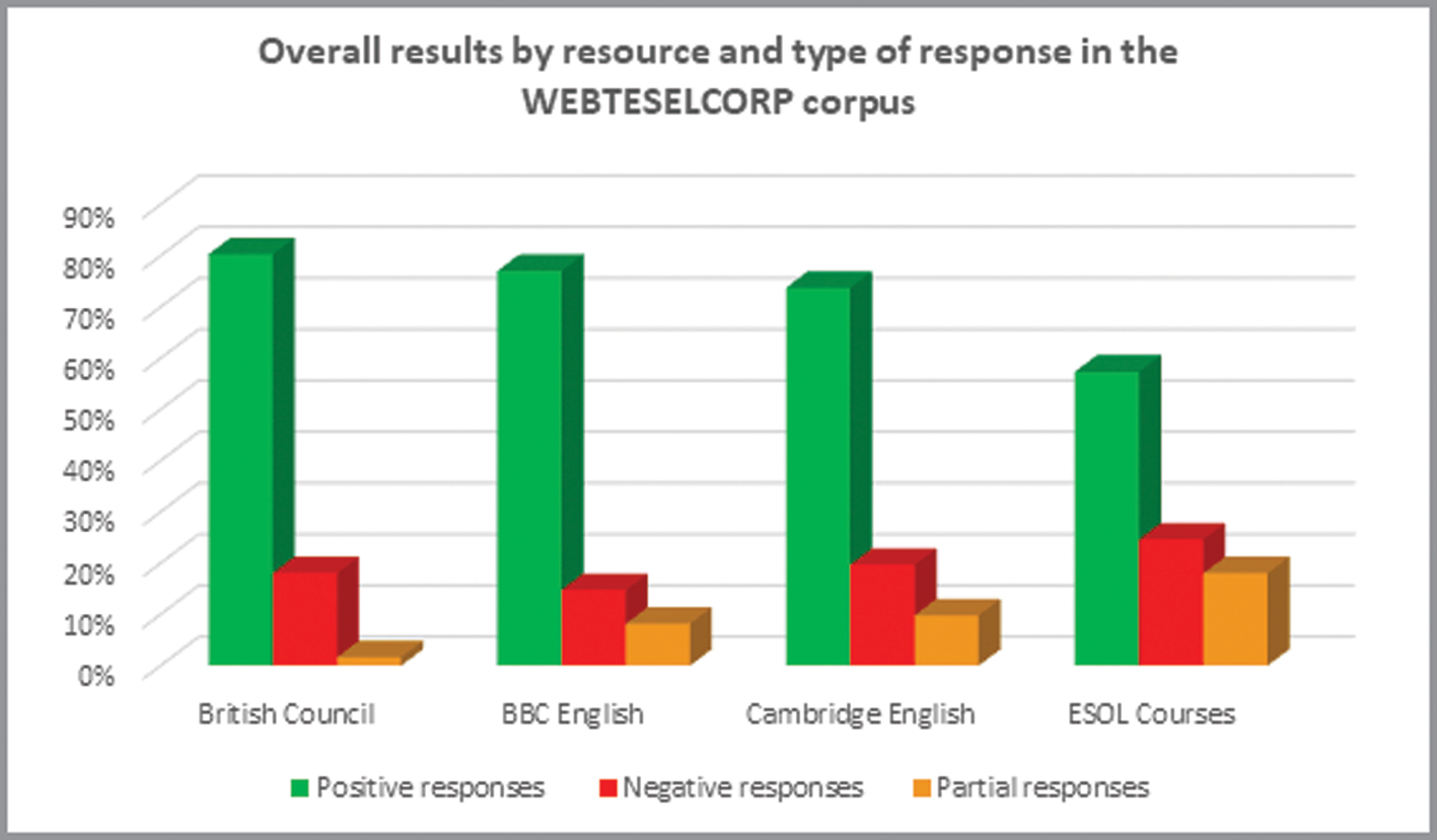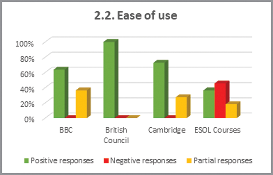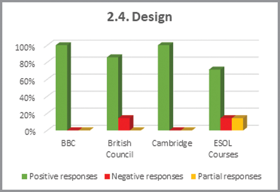 At the other end of the scale, the ESOL Courses website is the resource which has the most shortcomings. Here, the value of negative and partially met responses (42.6%) represents almost half of the total number of items. Moreover, it doubles (or nearly doubles) the other websites’ proportions of unfavourable responses as shown in British Council (19.7%) and BBC (23%).