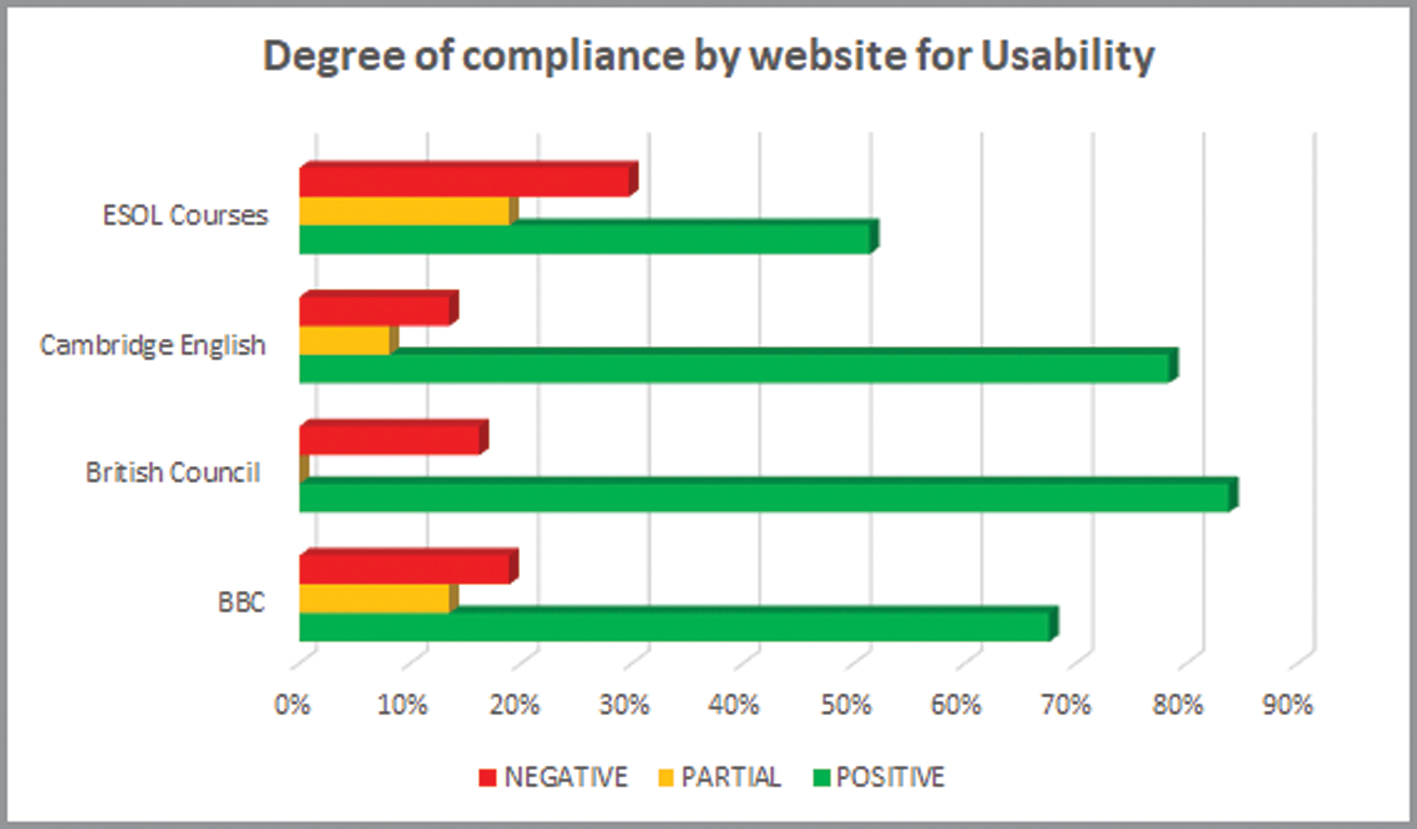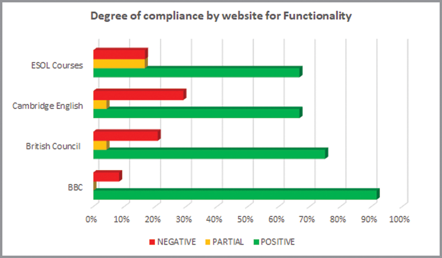 As far as the two main categories (Functionality and Usability) are concerned, Figure 2 illustrates the highest degree of item compliance on the British Council website, with 80.3% of positive responses. Furthermore, the sum of negative and partially met responses accounts for a marginally lower rate (19.7%) than that found on the BBC English online resource (23%).