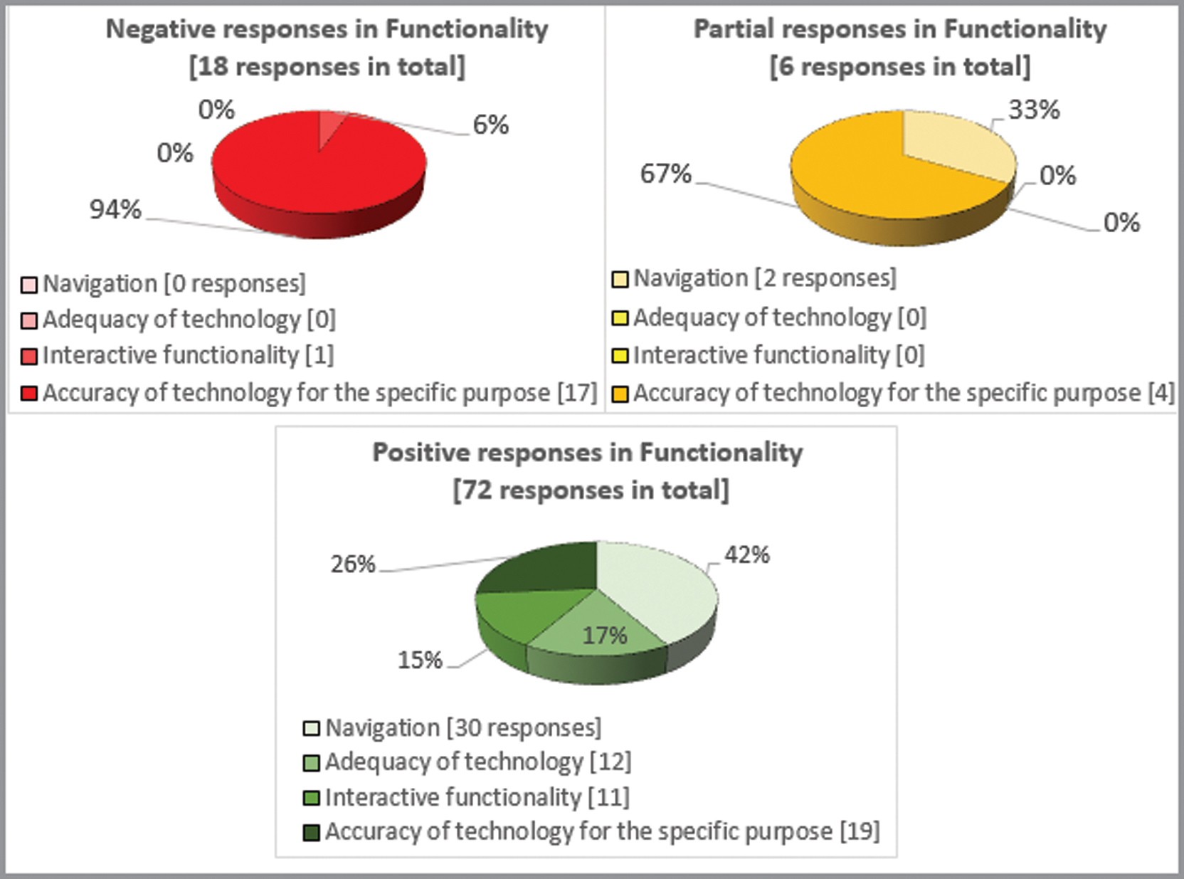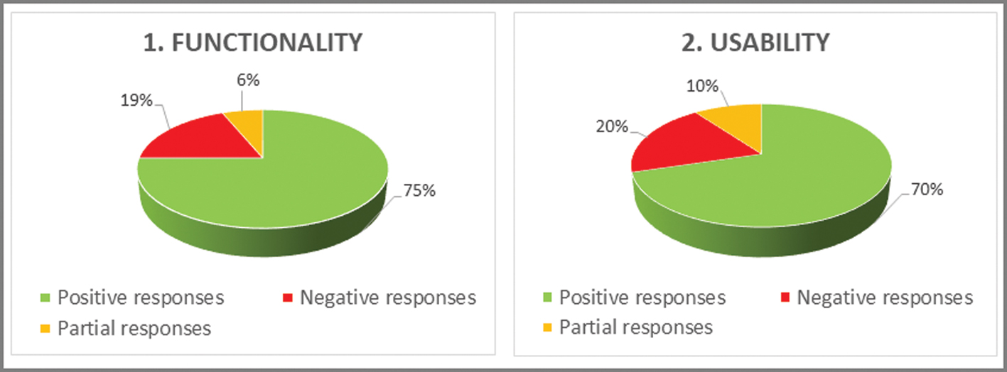 Although registered values are certainly similar for the two broad categories (Functionality and Usability), Figure 5 illustrates that a slightly greater percentage of negative and partial responses are concentrated in the Usability dimension (with 70% of positive responses compared to 75% in the ‘Functionality’ category).