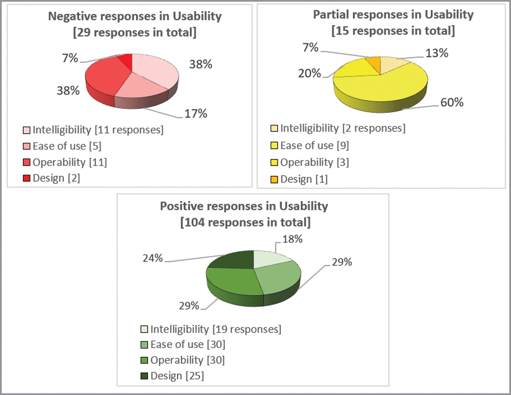 Considering the negative and partial results in Usability (see Figure 6), the subcategories showing major deficiencies are ‘Intelligibility’ and ‘Operability’ for the negative results (38% in both cases), while ‘Ease of use’ (60%) represents the weakest area with 9 out of 15 of partial responses. In contrast, positive responses are recorded particularly in the ‘Ease of use’ and ‘Operability’ subcategories, with 29% each.