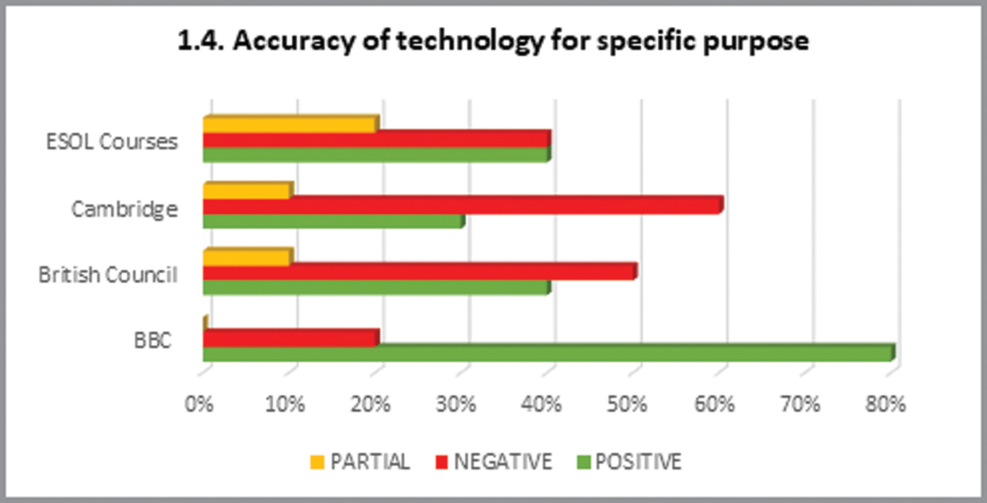 Focusing on significant shortcomings, most weaknesses are identified within the subcategory 1.4. ‘Accuracy of technology for the specific purpose’ (Functionality category). Figure 8 demonstrates that negative responses exceed the sum of positive and partial responses for Cambridge English, while there is a balance in these results for the British Council. The amount of positive and negative responses is the same in ESOL Courses, where items that are partially met or not met at all represent 60% of the total number of responses. However, the BBC resource is the one where only 20% of the results are negative for subcategory 1.4. Needless to say that this is an important feature since it is related to evaluation (item 1.4.3.), a crucial aspect for autonomous learning which needs improvement in most resources.