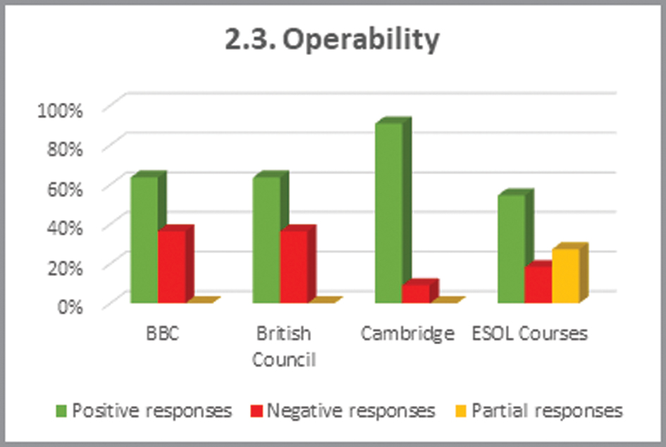 Here, we obtain a large majority (90%) of positive results, with only 10% of usability aspects that must be improved, as shown in Table 9. Identified shortcomings are related to the coherence, clarity and cleanliness of the interface design for ESOL Courses. Additionally, we experience difficulties differentiating some navigation buttons in the British Council resource.