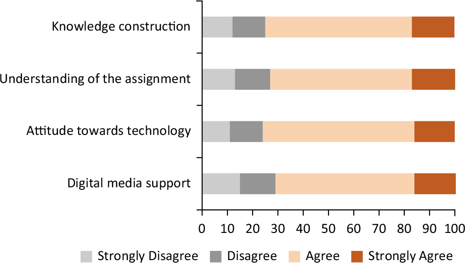 Although the cohorts were different in size, there were no significant statistical differences between the years, and so all the data were analysed together. Figure 1 presents student attitudes towards digital media assignments for the four constructs measured.