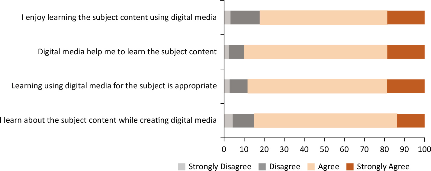 Figure 2. STEM student perceptions of digital media for learning science. N = 524, Years 1–3, STEM students, 2018. Results are presented in percentage ranging from strongly disagree, disagree, agree to strongly agree.